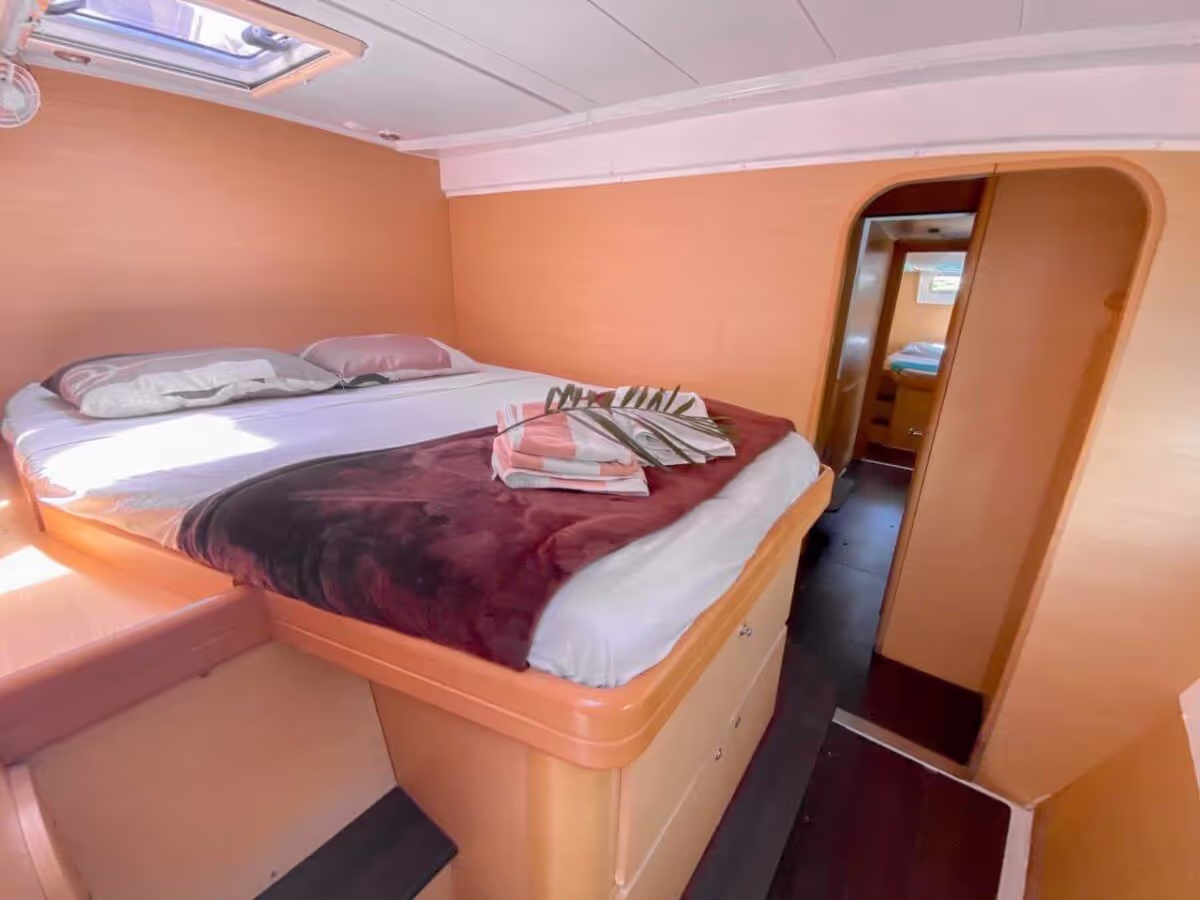 Descubra este lujoso catamarán de 42 pies, diseñado con curvas fluidas y un estilo dinámico, que ofrece una experiencia de navegación estable y cómoda. Con amplias cabinas, terrazas y una tripulación a bordo de primera calidad, este yate es perfecto para un día inolvidable en el Mar Caribe.