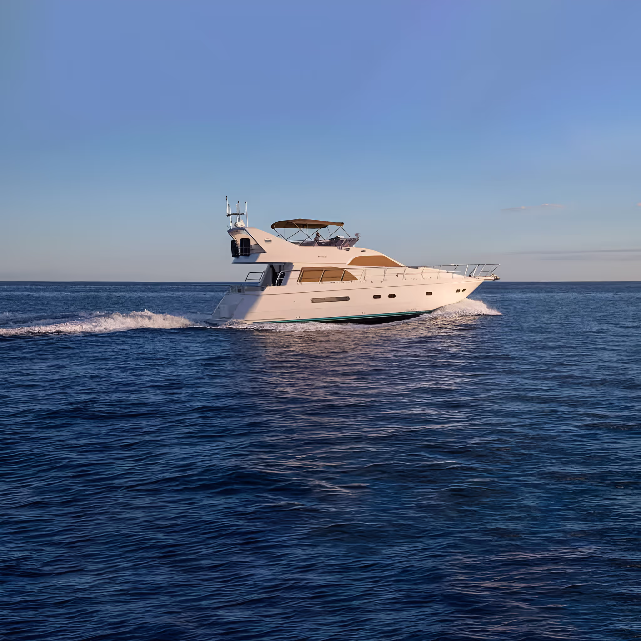 This sleek yacht offers 360-degree views from the flybridge and a spacious sun deck perfect for relaxing. Inside, enjoy the cool air-conditioned salon with comfortable U-shaped seating and a seamless galley.