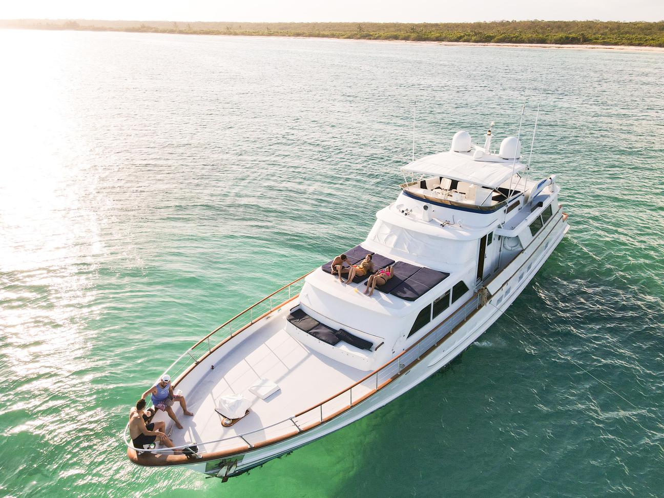 This vessel, refitted in 2023 is perfect for a scenic journey through the Riviera Maya. This 80ft yacht glides smoothly through the water. Relax in the spacious lounge and enjoy our custom-built all-inclusive bar.