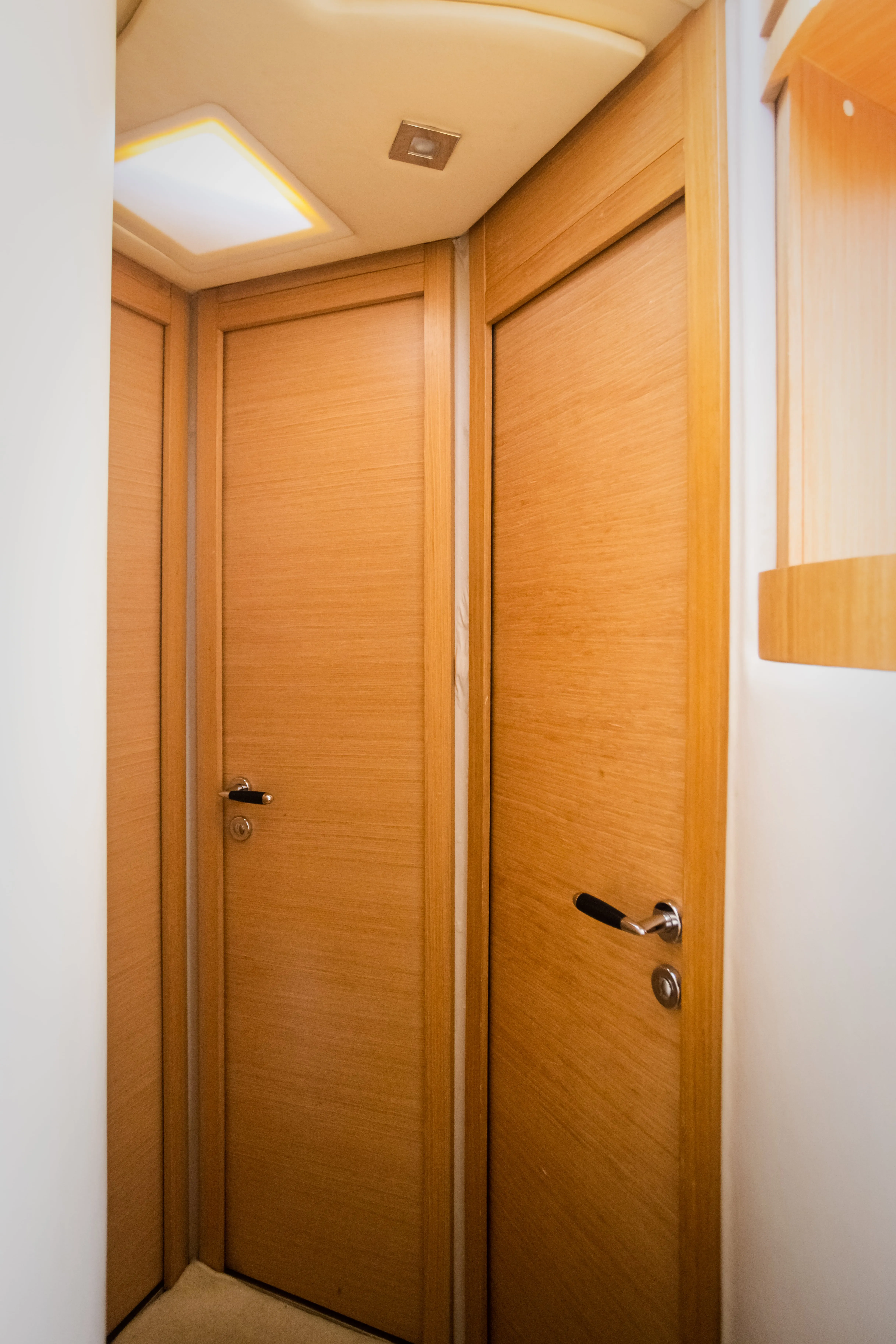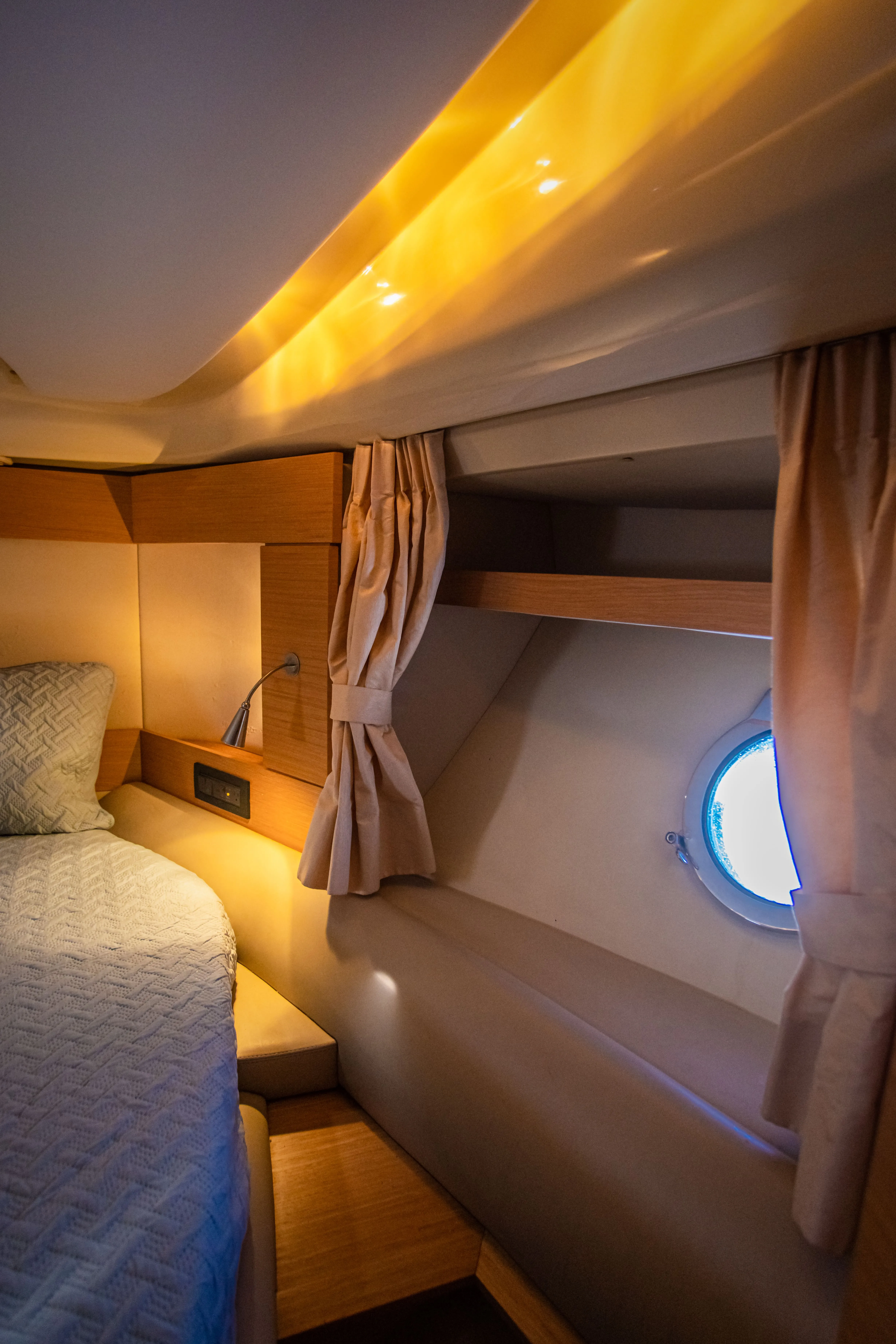 The interiors are exquisite, adorned with light woods that create plays of light and shadows against darker decorations. It offers two cabins (one with a Queen-size bed, the other with two single beds) and a bathroom in a comfortable and fully equipped navigation area.